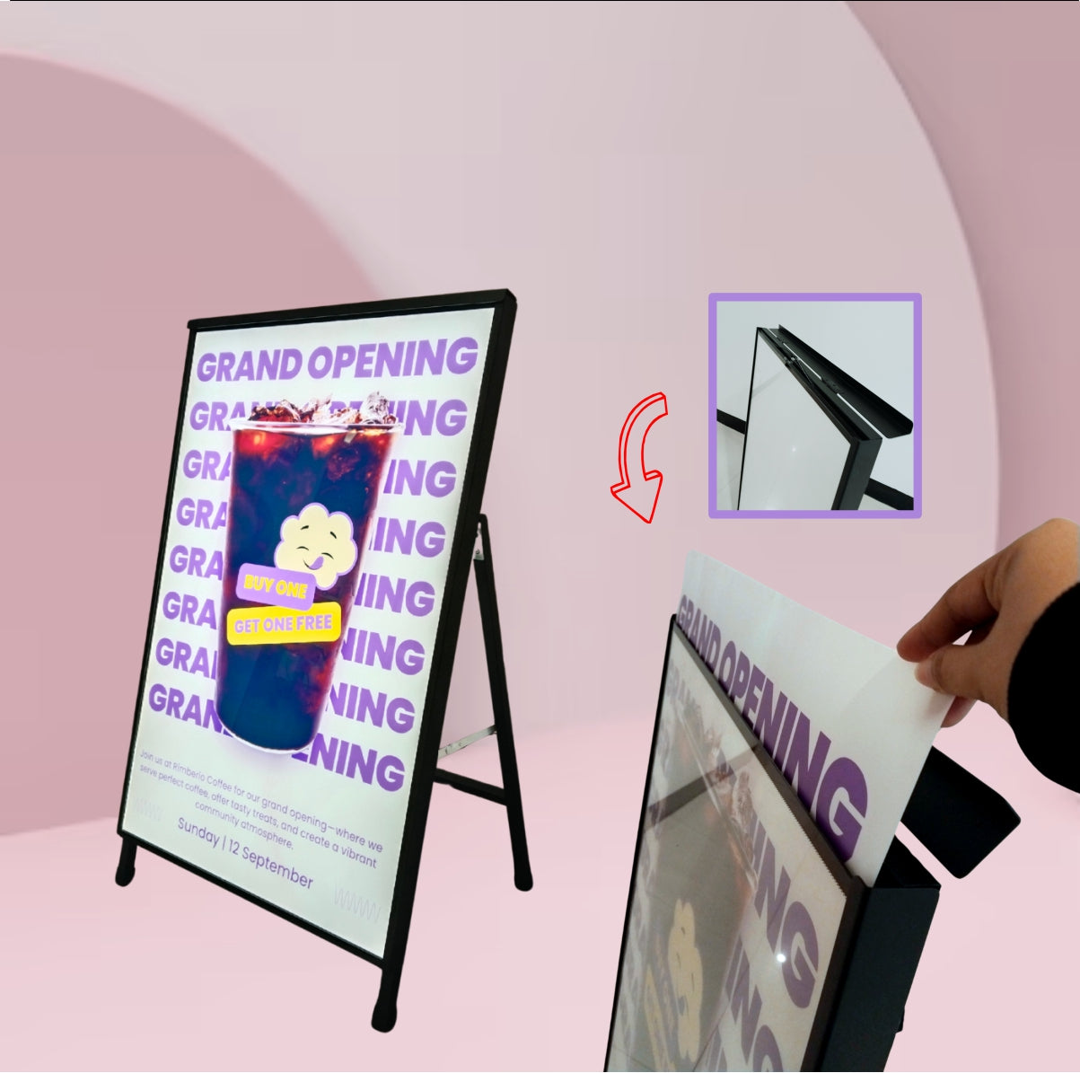 "Standee" (A-Frame steel structure with LED) must be purchased separately.